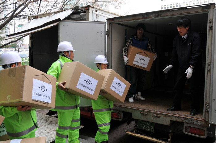 ▲ 서울시청노동조합 조합원들이 지난해 불우이웃돕기 행사를 위해 물품을 차량에 실고 있는 모습. <사진제공=서울시청노동조합> |