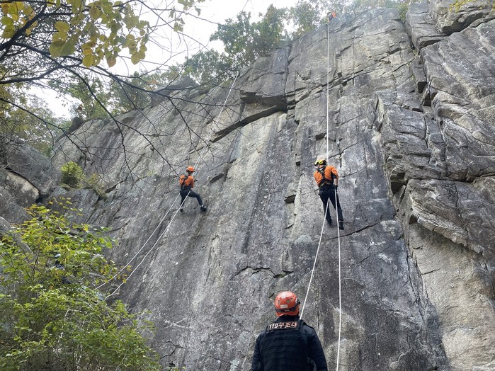 이날 훈련은 ▲개인안전 교육 ▲산악구조장비 운용 ▲추락, 조난 등 상황별 인명구조 기법 ▲드론 활용 구조대상자 수색 ▲수직·수평 및 도하훈련 ▲구조대상자 응급처치 및 헬기이송 훈련 등을 중점으로 진행했다.
