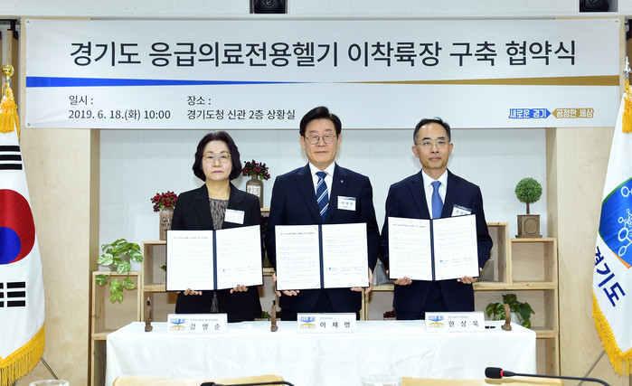 | ▲응급의료전용헬기 이착륙장 구축 협약식에서 (왼쪽부터)강영순 제1부교육감, 이재명 경기도지사, 한상욱 아주대학교병원장이 협약을 맺고 기념사진을 찍고 있다.(경기도교육청 제공) |