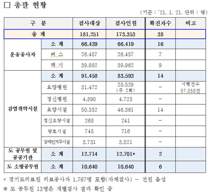 각 영역별로 선제검사 결과를 살펴보면 지난 15~21일까지 도내 요양병원 312곳, 정신병원 97곳, 요양시설 2,817곳, 정신요양시설 6곳, 양로시설 98곳, 장애인거주시설 313곳 등 총 3,643곳의 감염 취약시설 종사자 8만3593명을 대상으로 검사를 실시했다.