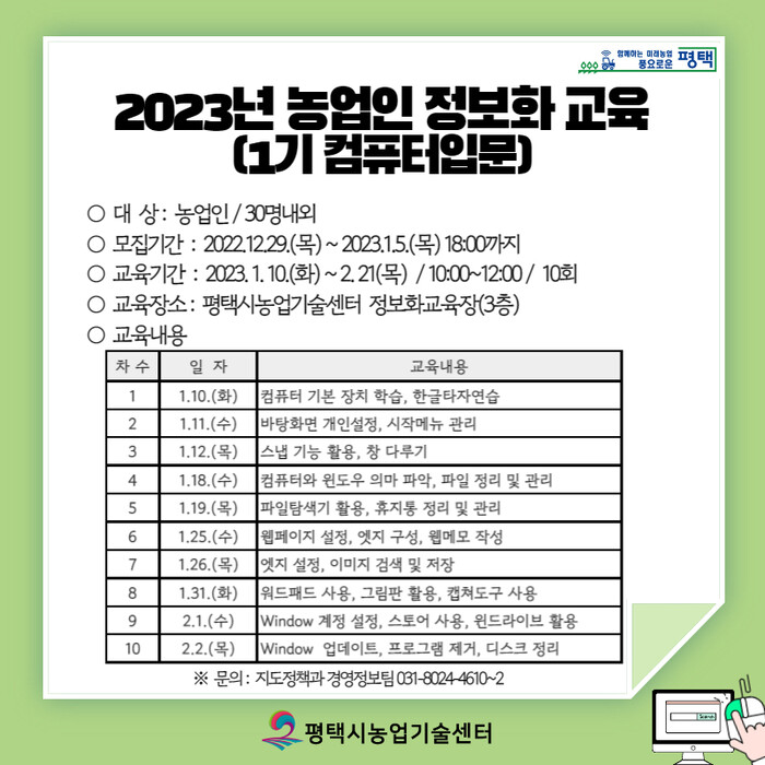 [로컬세계=김병민 기자] 평택시농업기술센터는 2023년 1월 10일부터 2월 2일까지 농업기술센터 정보화교육장에서 농업인 정보화교육을 실시한다고 밝혔다.