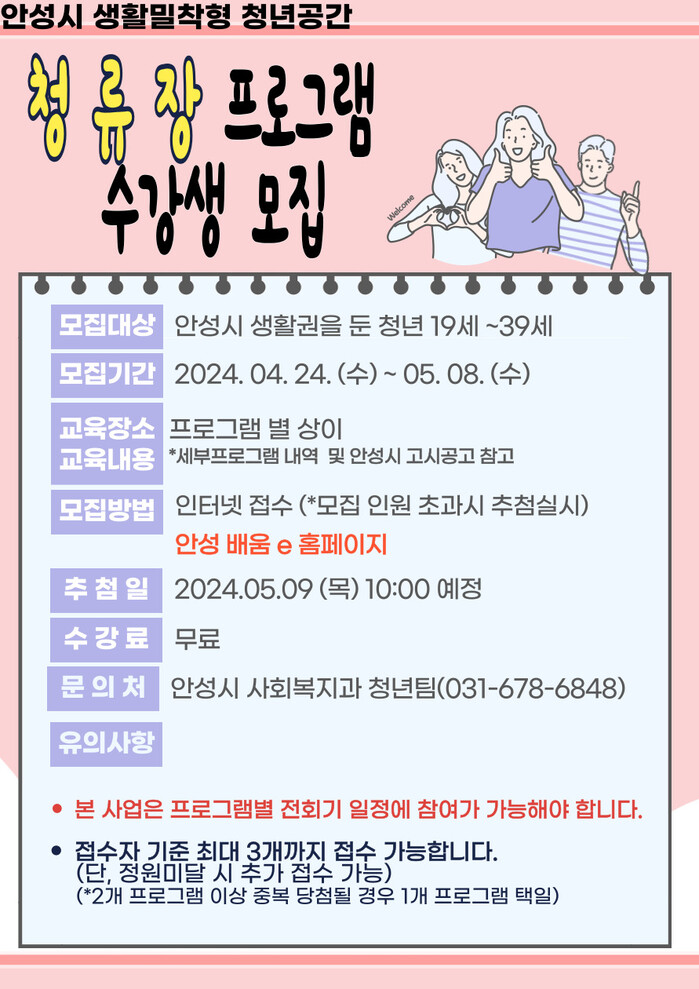 [로컬세계=김병민 기자]경기 안성시는 2024년 생활밀착형 청년공간 '청류장' 프로그램 1기 수강생을 모집한다.