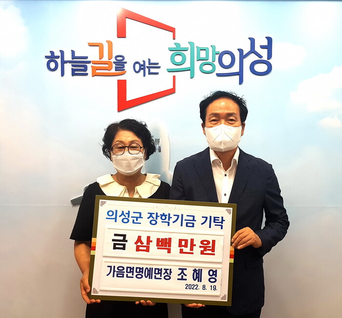 [로컬세계=박상진 기자]경북 의성군 (재)의성군인재육성재단(이사장 김주수 의성군수)은 지난 19일 조혜영 가음면 신임 명예면장이 인재육성과 후학들을 위해 장학기금 300만원을 쾌척했다고 밝혔다.