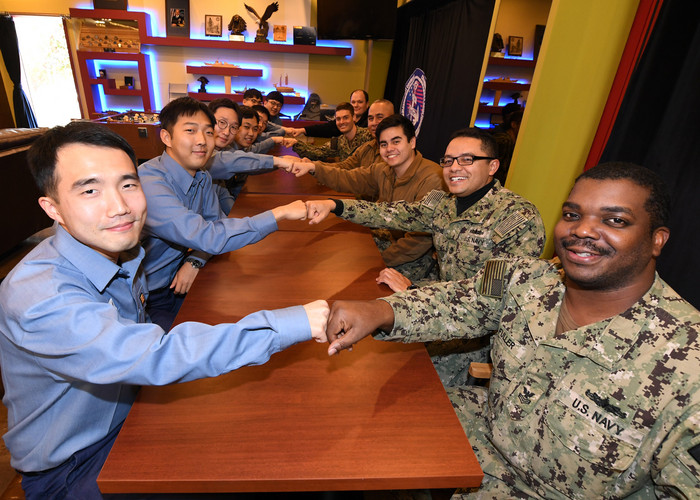| ▲해군작전사 네이비 클럽에서 해군작전사 수병과CNFK장병이 주먹을 맞대며 기념촬영을 하고 있다.(해군작전사 제공) |