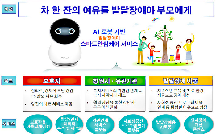 이번에 선정된 ‘AI로봇기반 발달장애아동 스마트안심케어 서비스’는 국가 4차산업혁명시대에 맞춰 창원시가 역점적으로 추진하고 있는 AI기술과 빅데이터, 로봇과 IOT 기술을 접목된 서비스이다.