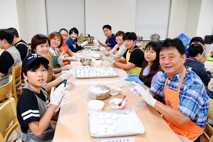 ▲ 최문순 군수(앞줄 오른쪽)가 가족봉사단원들과 함께 송편을 빚고 있다. |