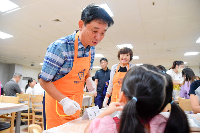▲ 최문순 군수가 송편 나눔 활동 봉사에 참여한 어린이를 독려하고 있다. |