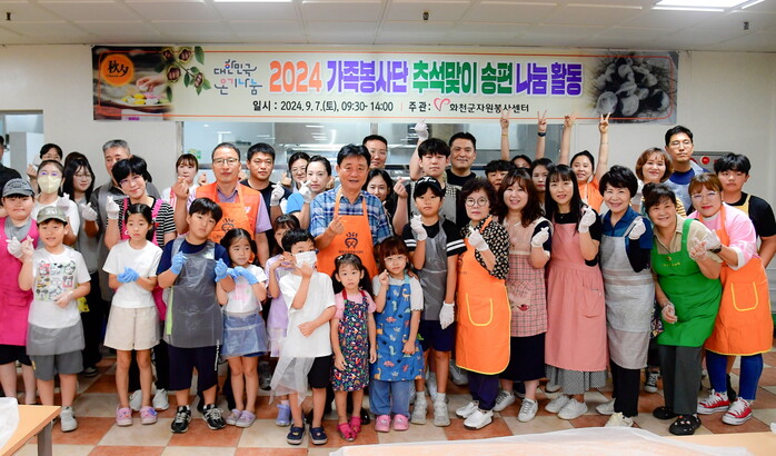 ▲ 최문순 군수와 가족봉사단 70여 명이 참석한 가운데 '2024 추석맞이 가족봉사단 송편 나눔활동' 행사가 화천여성회관 식당에서 열렸다.(가운데 최문순 군수) |