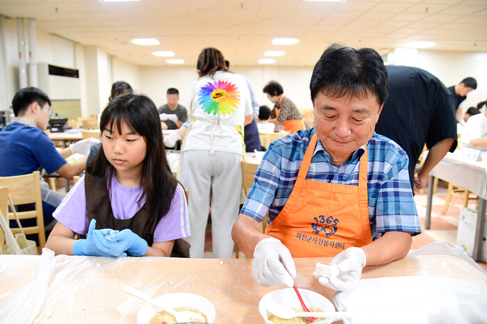 [로컬세계 = 전경해 기자] 2024 추석맞이 가족봉사단 송편 나눔활동 행사가 7일 화천여성회관 식당에서 최문순 군수와 가족봉사단 70여 명이 참석한 가운데 열렸다.(사진=화천군 제공)