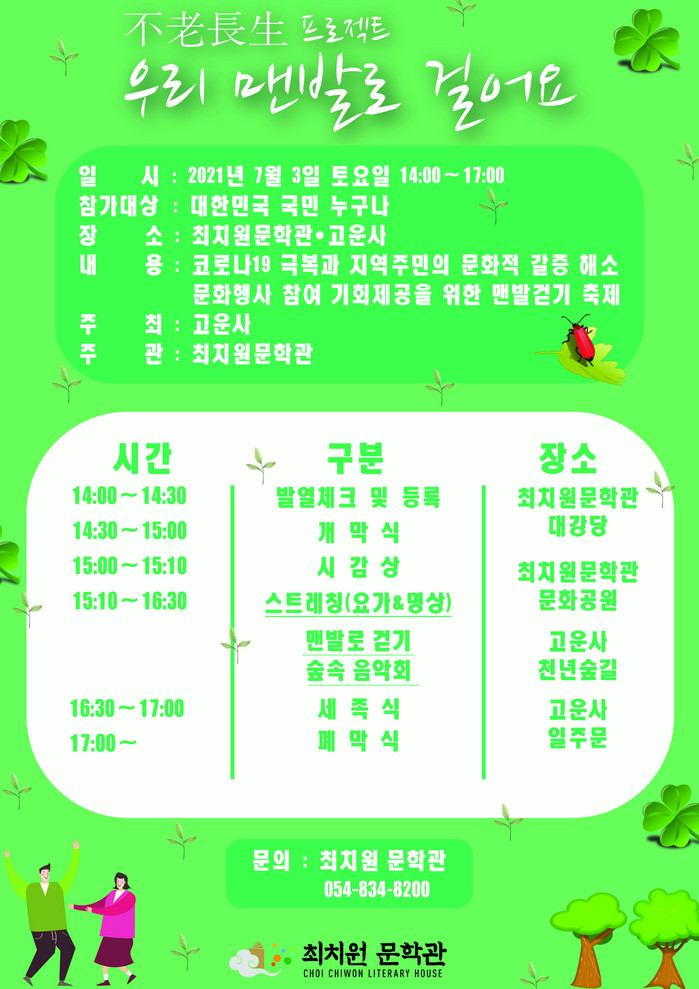 [로컬세계 박상진 기자]경북 의성군 최치원문학관은 오는 7월 3일‘不老長生(불로장생) 프로젝트-우리 맨발로 걸어요’행사를 개최한다고 30일 밝혔다.