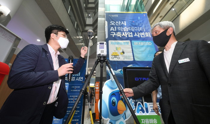 [로컬세계 김병민 기자]경기 오산시(시장 곽상욱)가 ‘2021년도 인공지능 학습용 데이터 구축사업’으로 추진 중인 로봇 자율배송 시범운행과 실내공간3D 제작 시연회를 12일 시청 로비에서 개최했다.