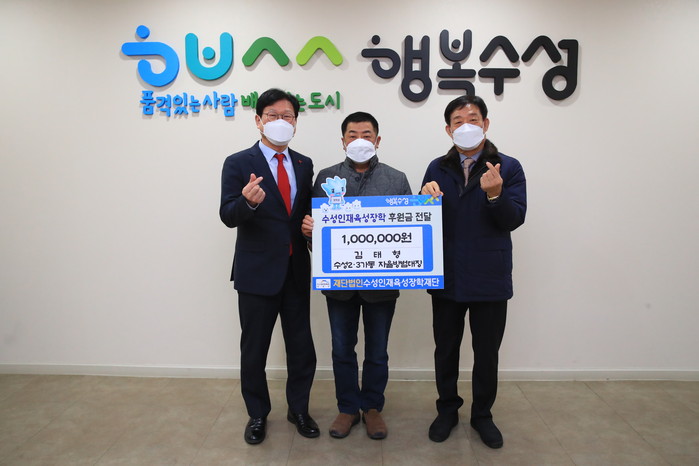 이성로 수성인재육성장학재단 이사장은 “2022년 새해를 맞아 장학금을 기탁해주신 김태형 대장님께 감사드린다”며, “우리 지역 인재들이 휼륭한 사회 일원으로 성장할 수 있도록 지원하겠다”고 말했다.