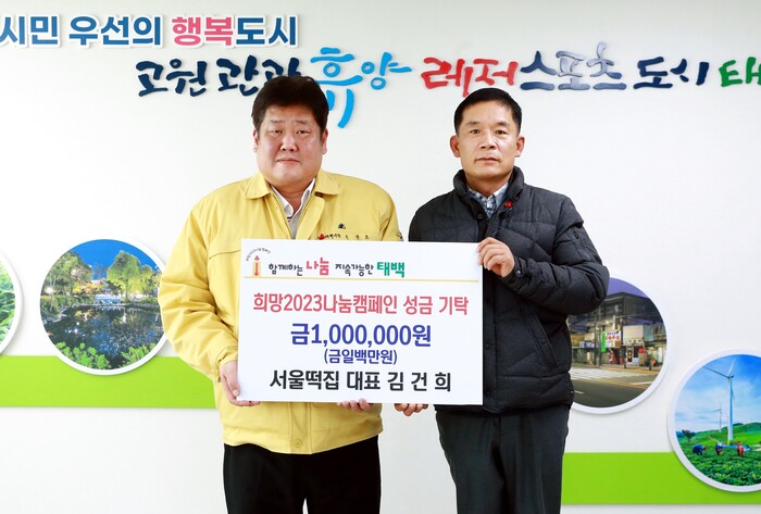 [로컬세계=박상진 기자] 태백 서울떡집(대표 김건희)은 지난 27일 태백시청을 방문해 저소득층 가구를 위해 써달라며 희망2023나눔캠페인 이웃돕기 성금 100만원을 지정 기탁 했다.