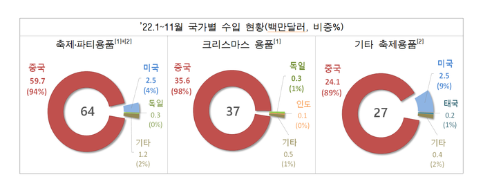 축제·파티 용품의 주요 수입처는 중국으로 94%로 압도적 비중을 차지했으며 다음으로 미국(4%), 독일 등 순이다.