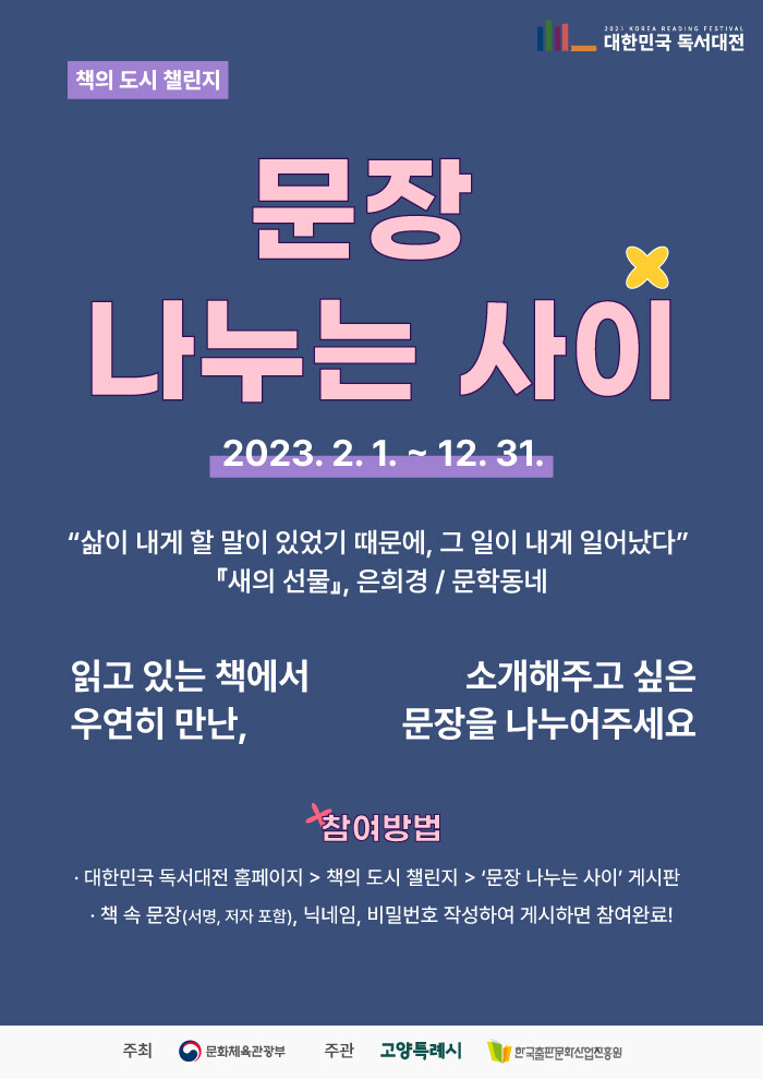 [로컬세계 = 이영원 기자]경기 고양특례시는 오는 2월 1일부터 '대한민국 독서대전' 책의 도시 챌린지 두 번째 프로그램인 ‘문장 나누는 사이’를 시작한다.