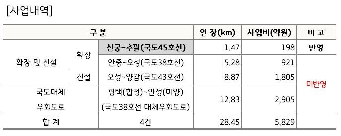 또 평택시는 B/C 부족 및 비수도권 지역균형발전 평가항목 등으로 예비타당성조사에서 미반영된 국도38호선 확장(안중~오성) 등 3개 사업에 대해 타당성 재조사 등 자료보완을 통해 ‘제6차 국도・국지도 건설 5개년 계획’에 재건의할 예정이라고 밝혔다.