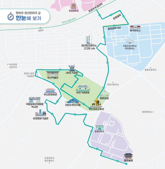 [로컬세계 부산=맹화찬 기자]부산시 남구(구청장 오은택)는 UN기념공원을 중심으로 한 역사·평화 거점과 경성대·부경대 대학로 청년 문화공간을 연결하는 '평화와 청년문화의 길 스마트 보행로 조성 사업'을 완료했다.