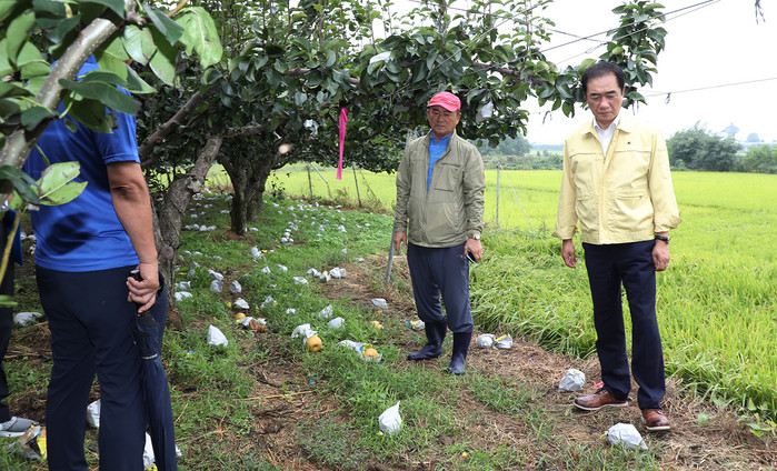 [로컬세계 고용주 기자]정장선 평택시장이 지난 9일 태풍 ‘링링’으로 피해를 입은 오성면 숙성리 배 낙과 피해 농가를 찾아 피해 현황을 살피고 애로사항을 청취했다.