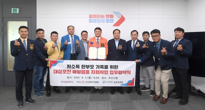 [로컬세계=김병민 기자]경기 오산시는 지난 5일 오산로타리클럽, 송호욱병원과 저소득층 한부모를 위한 ‘대상포진 무료 예방접종 지원사업’을 위한 업무협약을 체결했다고 6일 밝혔다.