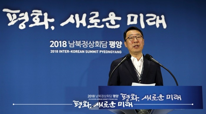 남북정상회담 3일 째인 20일 윤 수석은 서울프레스센터에서 브리핑을 갖고 “70년 만에 전쟁을 끝내고 평화와 번영을 위한 새로운 시간이 흐르고 있다”며 “대한민국 국민과 정부가 한 팀이 되어 지금의 시간을 이뤄가고 있다는 데 많은 자부심을 느끼고 있다”고 밝혔다.