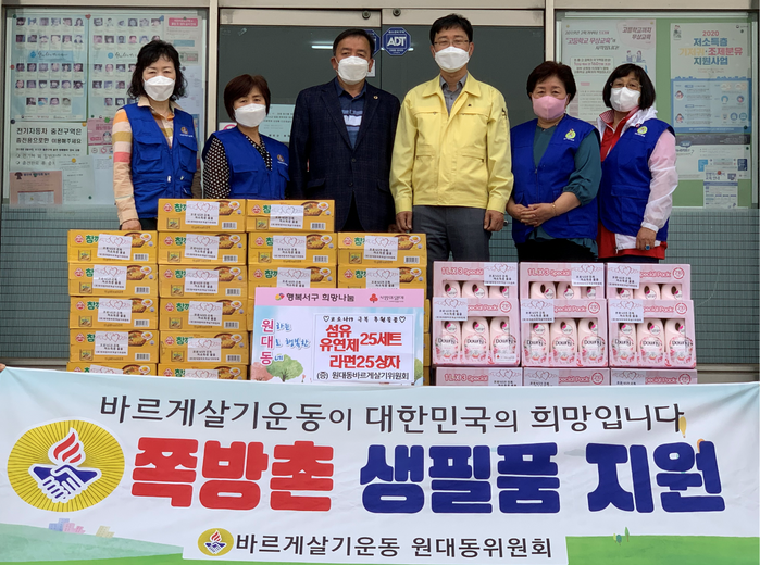 [로컬세계 박세환 기자]대구 서구 원대동 바르게살기위원회(위원장 신준현, 여성회장 최영숙)에서는 지난 14일 코로나19로 어려움을 겪고 있는 관내 저소득 주민과 쪽방촌 주민 25세대에 생필품 세트(60만원 상당)를 전달했다.