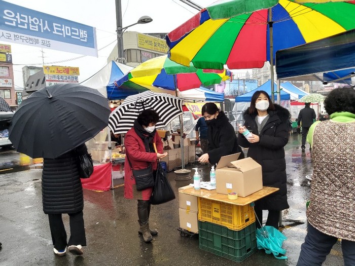 시는 앞서 소비자의 안전한 장터 방문을 위한 예방수칙 홍보와 함께 관내 전통시장상인회와 양곡5일장에 손소독제와 마스크를 배부한 바 있으며, 14일 하성5일장까지 손소독제 총 600개와 마스크 총 1600개를 배부할 예정이다.