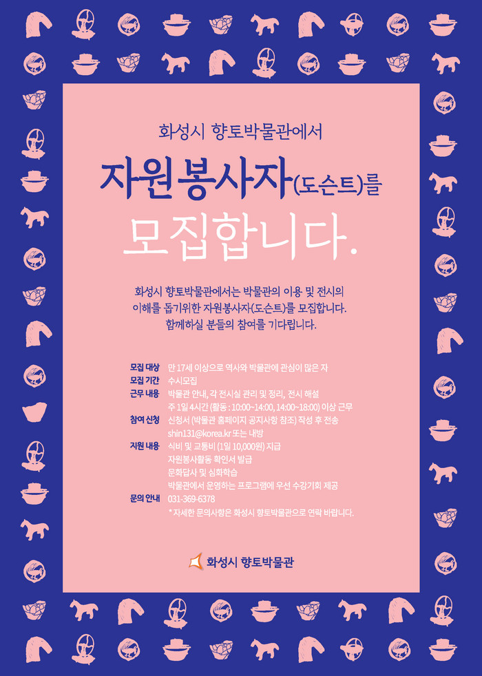 자원봉사를 희망하는 시민은 화성시 향토박물관 홈페이지(hsmuseum.hscity.go.kr)에서 신청서를 다운받아 이메일(shin131@korea.kr) 또는 학예연구실로 방문 접수하면 된다.