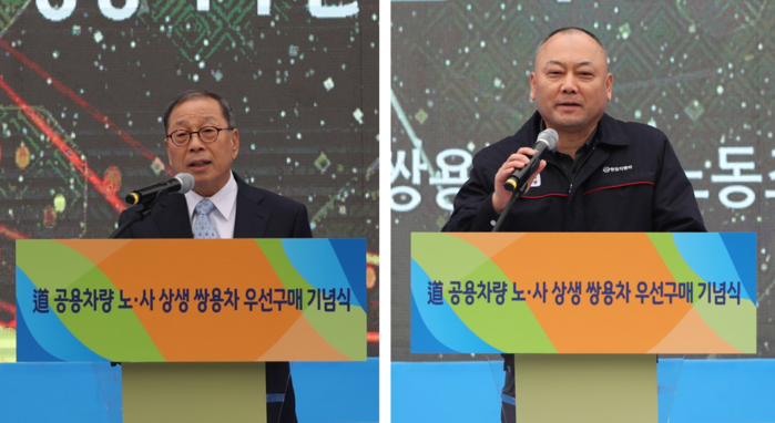 ▲최종식 쌍용차 대표이사(왼쪽)와 정일권 쌍용차 노동조합 위원장이 인사말을 전하고 있다. |
