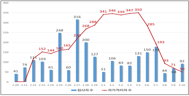 | ▲자가격리자/검사자 변동 추이. |