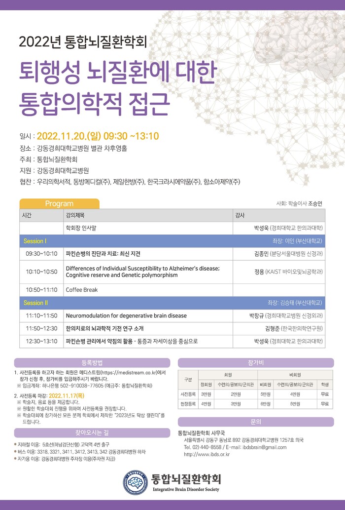 참가 신청은 메디스트림(https://medistream.co.kr)에서 가능하며, 문의는 통합뇌질환학회 사무국으로 하면 된다.