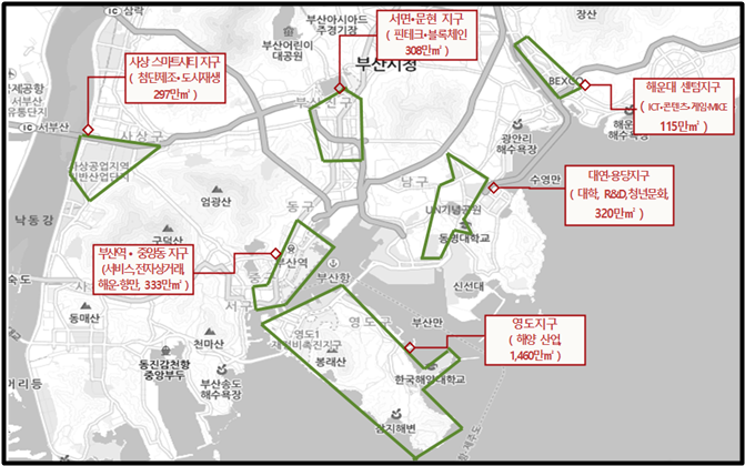 지정 대상지는 산업별로 특화된 6개 지구로 센텀 지구(ICT·콘텐츠·게임·MICE), 서면·문현 지구(핀테크·블록체인), 대연·용당 지구(대학, R&D, 청년문화), 부산역·중앙동 지구(서비스·물류·전자상거래·해운·항만), 사상스마트시티 지구(첨단제조), 영도 지구(해양산업)이며, 총 2833만㎡ 규모다.