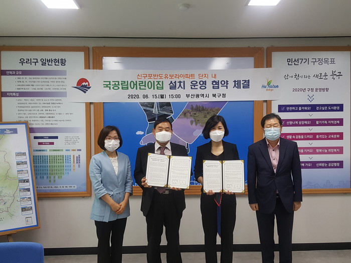 [로컬세계 맹화찬 기자]부산시 북구(구청장 정명희)는 지난 15일 신구포반도유보라아파트 사업주체인 구포3구역 주택재개발 정비사업 조합과 단지 내 관리동 어린이집을 국공립으로 설치하기 위한 업무협약을 체결했다.