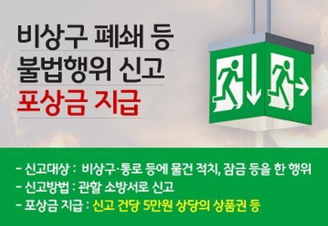 신고포상제는 비상구 관리 의무 위반행위를 신고하는 시민에게 포상금을 지급함으로써, 비상구 확보에 대한 경각심을 일깨워 안전문화를 정착시키고 안전의식 제고를 위해 마련된 제도다.