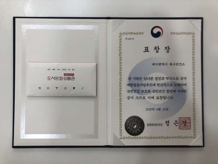 [로컬세계 박세환 기자]대구 북구보건소는 제10회 예방접종 주간을 맞이해 2020년 국가예방접종사업 우수기관으로 선정돼 지난 24일 질병관리본부장상을 수상했다고 29일 밝혔다.