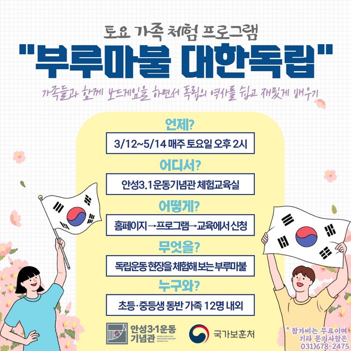 오는 3월 12일부터 5월 14일까지 매주 토요일 무료로 진행되는 이번 프로그램은 선착순으로 참가자를 모집하며, 신청 관련 사항은 안성3·1운동기념관 홈페이지에서 확인할 수 있다.