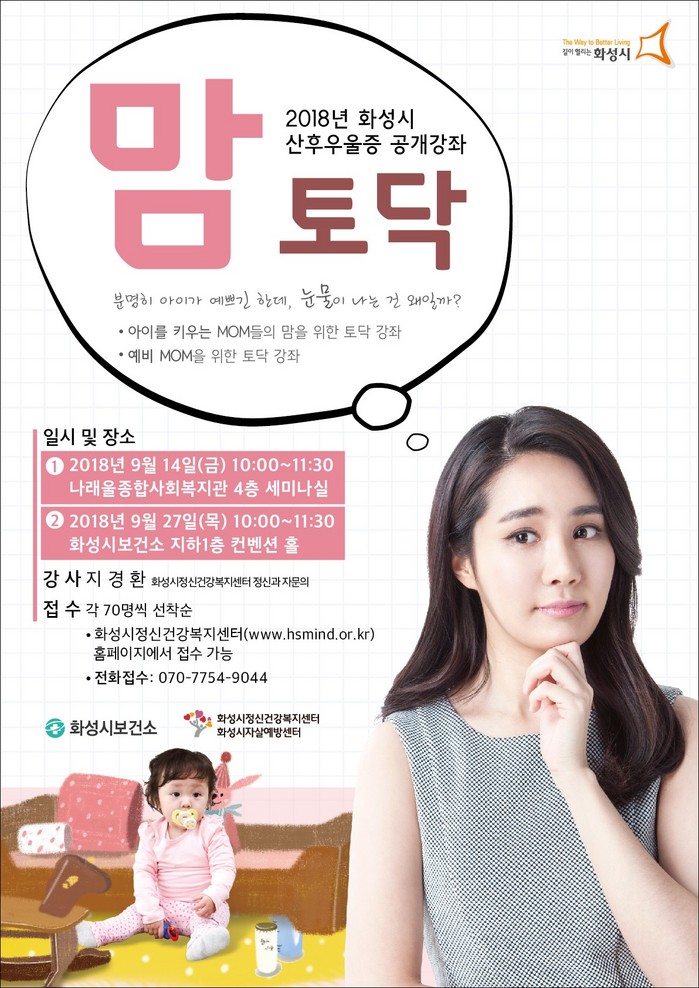 공개강좌는 오는 14일 나래울종합사회복지관과 27일 화성시보건소에서 오전 10시부터 1시간 30분 동안 진행된다. 지경환 정신건강 전문의가 초빙돼 산후우울증 증상과 예방법을 다양한 사례를 통해 소개할 예정이다.