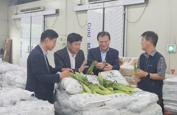 ▲ 12개 서울농협 하나로마트는 괴산 군자농협에서 생산한 찰옥수수 2,100자루를 시중가격 대비 저렴하게 판매해 수해지역 농산물의 소비촉진 및 판로확보를 도왔다. (사진은 왼쪽부터 김승철 군자농협 상임이사, 황준구 농협중앙회 서울본부장, 장만선 동서울농협 조합장, 김영문 서울농협 하나로마트 점장협의회장) 끝. 농협 제공 |