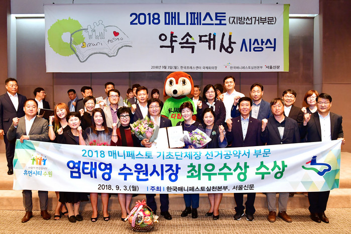 2014 매니페스토(지방선거 부문) 약속대상에서 최우수상을 받은 염태영 시장은 ‘2회 연속 최우수상’이라는 영예를 안았다.