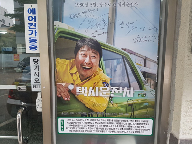 사진 속 영화 '택시운전사' 포스터에는 송강호와 고창석의 지난해 6월 12일 싸인이 새겨져 있다. 입구에 포스터가 마치 송강호가 밝게 웃으며 손님을 맞이하는듯하다.