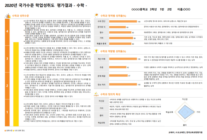 학업성취도평가는 교과별 성취 수준, 영역·역량별 성취율 등과 같은 인지적 평가 결과 뿐만 아니라 자신감, 가치, 흥미, 학습 의욕, 사회·정서적 역량 등과 같은 비인지적 특성에 대한 평가 결과를 제공해 학생의 전인적 성장을 지원하는 것을 목적으로 한다.