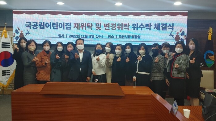 이날 체결식에는 최초 5년 위탁 기간이 만료된 시립나리어린이집 등 10개소에 대한 재위탁과 위탁운영 포기 등에 따른 시립오산자이어린이집 등 4개소에 대한 위탁체를 선정하고 위수탁계약을 체결했다.