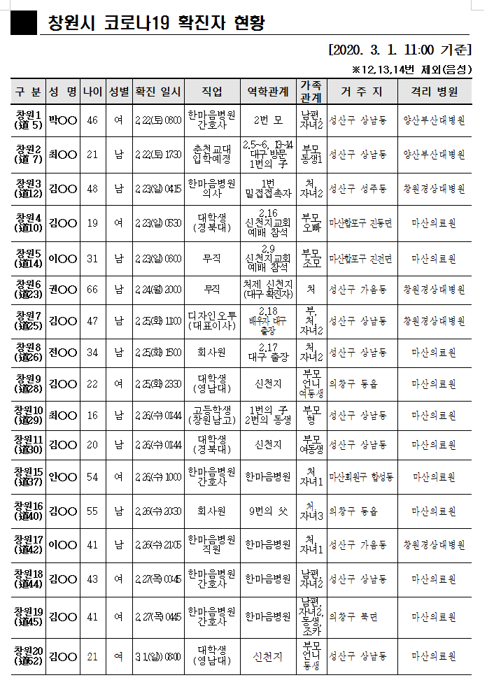 20번(경남 62번) 확진자는 성산구 상남동에 거주하는 20대 여성으로 가족관계는 부모, 언니, 동생이 있으며 신천지 교인이다.