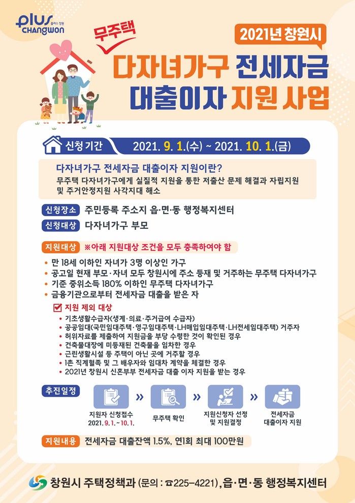[로컬세계 권인진 기자]경남 창원시는 9월 1일부터 10월 1일까지 주소지 읍·면·동 행정복지센터에서 무주택 다자녀가구 전세자금 대출이자 지원 사업을 접수한다고 24일 밝혔다.