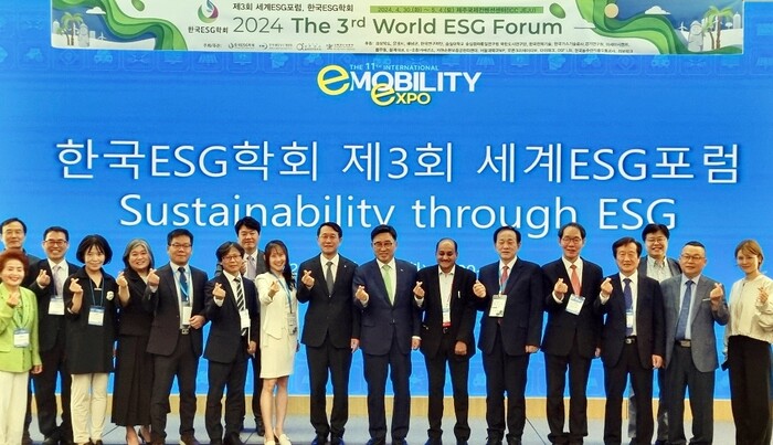 ▲ 제3회 World ESG포럼 기념사진. 한국농수산식품유통공사 김춘진 사장(우측 8번째), 한국ESG학회 고문현 학회장(우측 5번째) |