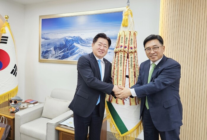 ▲ 제주도청 방문. 한국농수산식품유통공사 김춘진 사장(우측), 오영훈 제주도지사(좌측) / aT 제공 |