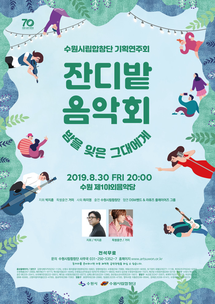수원시와 수원시립합창단이 마련한 ‘잔디밭 음악회-밤을 잊은 그대에게’가 오는 30일 저녁 8시 수원 제1야외음악당에서 펼쳐진다. 수원시립합창단과 가수 거미, 프로젝트팝오케스트라 등이 출연한다.