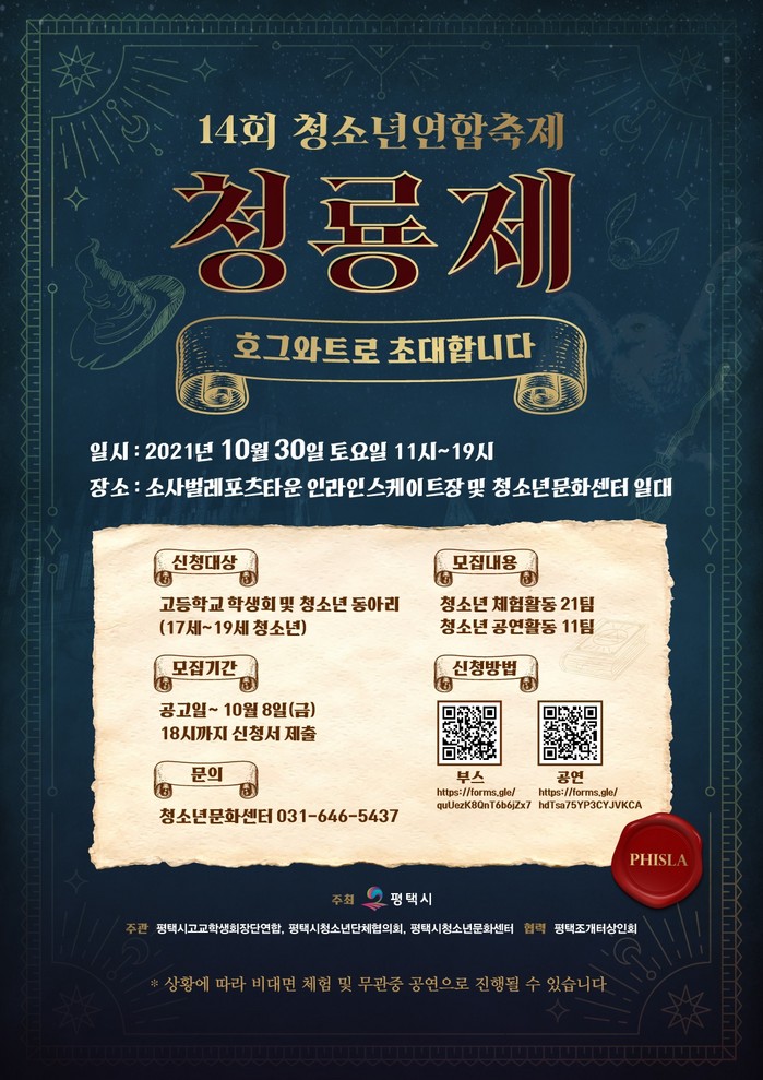 [로컬세계 김병민 기자]경기 평택시 위탁기관인 (재)평택시청소년재단 평택시청소년문화센터는 제14회 청소년연합축제 ‘청룡제’에 참여할 체험부스 및 공연팀을 8일까지 모집한다.