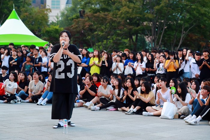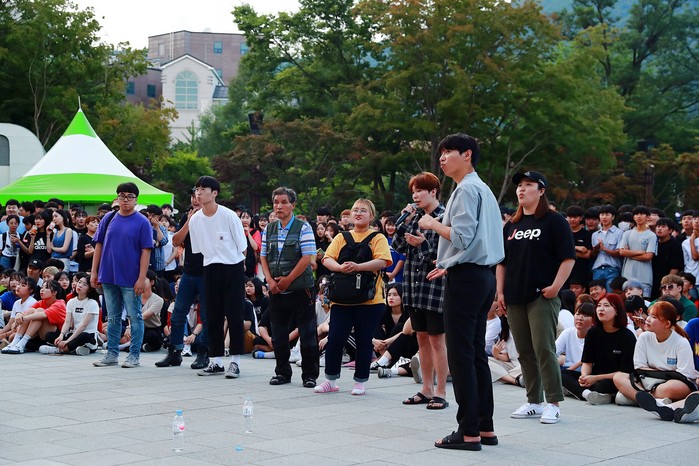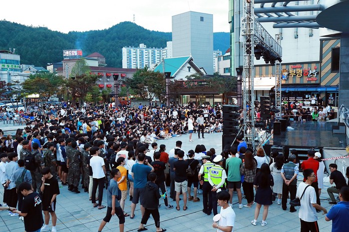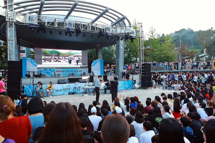 제4회 한강·낙동강 발원지 축제가 개막한 가운데 첫 주말을 맞은 지난 27일 강원 태백문화광장에서 ‘창현 거리 노래방’ 즉석 노래 경연대회에 참가자들이 몰리면서 인산인해를 이루고 있다.