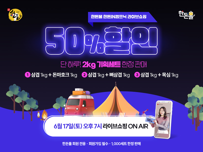 한돈자조금관리위원회(이하 한돈자조금)에서 운영하는 공식 온라인 쇼핑몰 ‘한돈몰’은 오는 17일 오후 7시부터 한돈 캠핑세트를 50% 할인 판매하는 ‘한돈IN캠프닉 라이브쇼핑’ 방송을 진행한다.