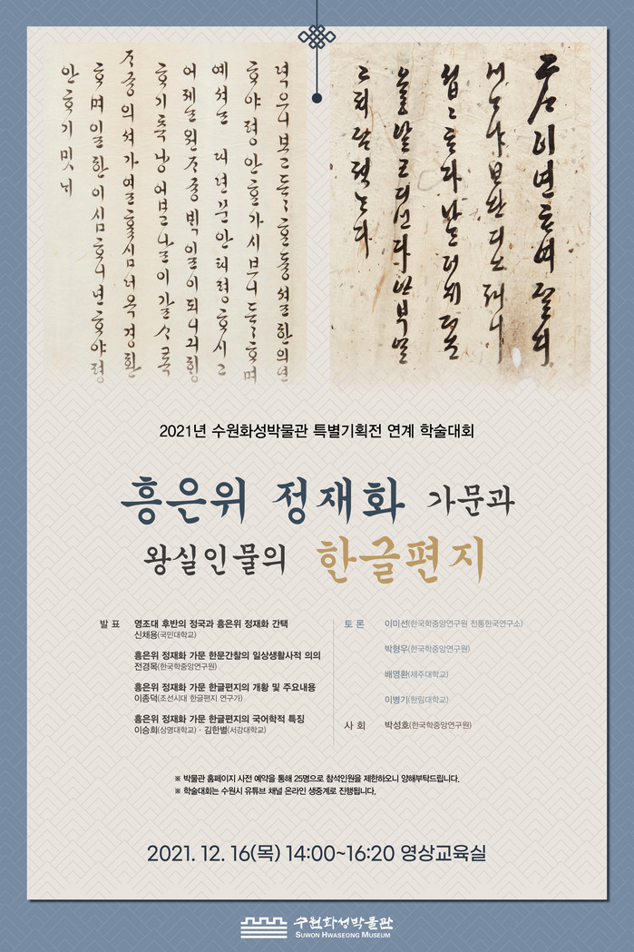 수원화성박물관 관계자는 “흥은위 정재화 가문과 왕실인물 사이에 주고받은 한글편지와 한문간찰을 통해 왕실의 생활문화와 왕실 부마 가문의 일상생활사와 한글편지의 국어학적 특징을 살펴볼 수 있는 학술대회”라며 “임금의 사위인 부마의 간택과정과 시대 상황도 소개한다”고 밝혔다.